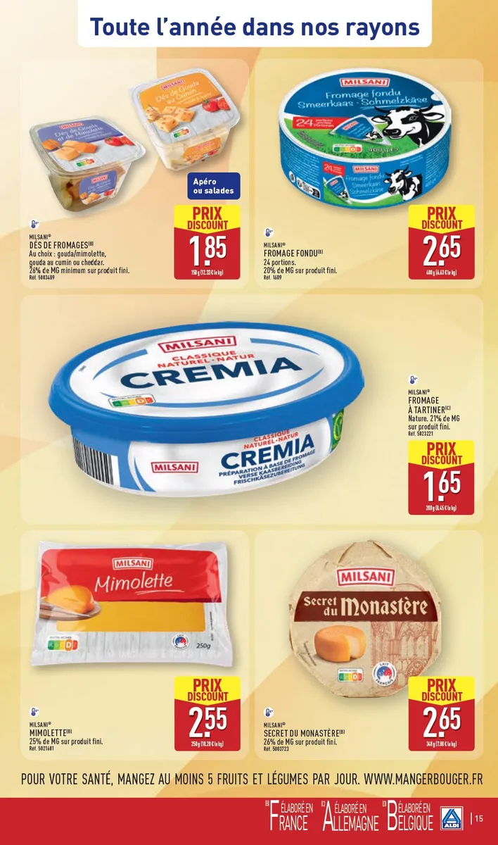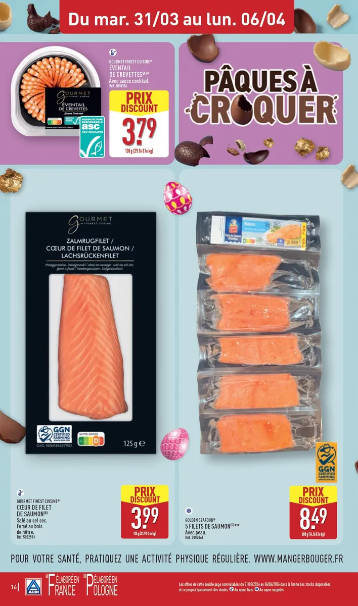 Aldi vous invite à célébrer les fêtes de Pâques avec une sélection de produits gourmands à prix cassés. Du 31 mars au 6 avril, découvrez des offres exceptionnelles pour concocter des repas mémorables. Pour bien commencer les festivités, le catalogue Aldi catalogue 31/03/2026 – 06/04/2026 promo cette semaine cette semaine met en avant des produits de la gamme Gourmet Finest Cuisine. Laissez-vous tenter par le saumon fumé de Norvège, élevé sans antibiotiques et fumé au bois de hêtre, proposé à seulement 7,99€ les 280g. Les amateurs de charcuterie italienne ne seront pas en reste avec le Prosciutto Crudo, un jambon de Parme prêt à cuire, disponible pour 7,49€ les 350g.