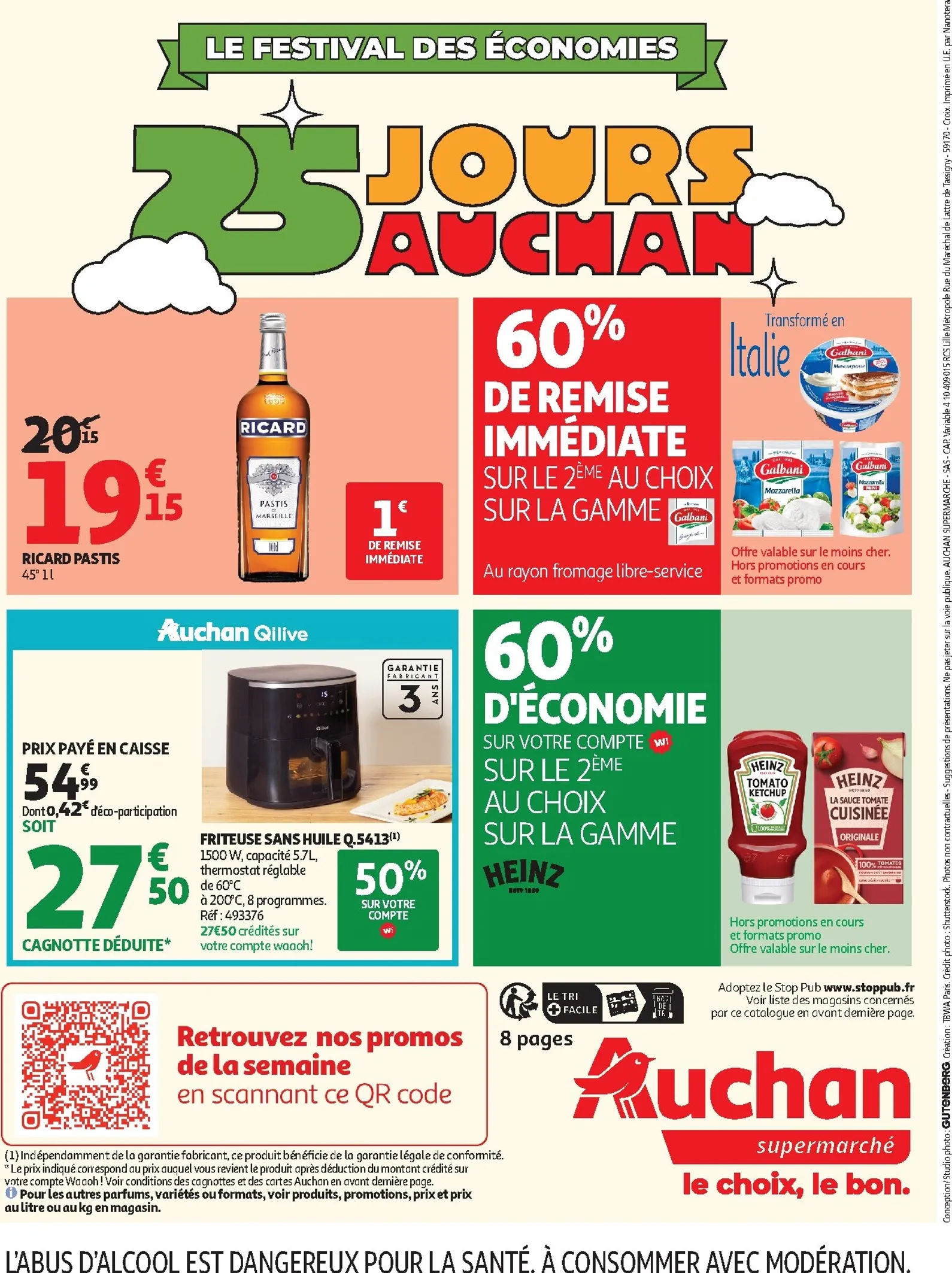 Le festival des économies s’étend à tous les rayons. Profitez de 60% de remise immédiate sur le deuxième produit au choix des gammes Heinz et fromage libre-service Galbani. Pour l’apéritif, la bouteille de Pastis Ricard est à un prix spécial. Ne manquez pas la promotion exclusive sur la friteuse sans huile Qilive, qui revient à 27,50€ après déduction de la cagnotte. Pour ne rater aucune de ces offres incroyables, Auchan Catalogue du 14/04/2026 est votre meilleur allié. Retrouvez tous les détails dans le dernier Auchan Catalogue disponible en ligne.
