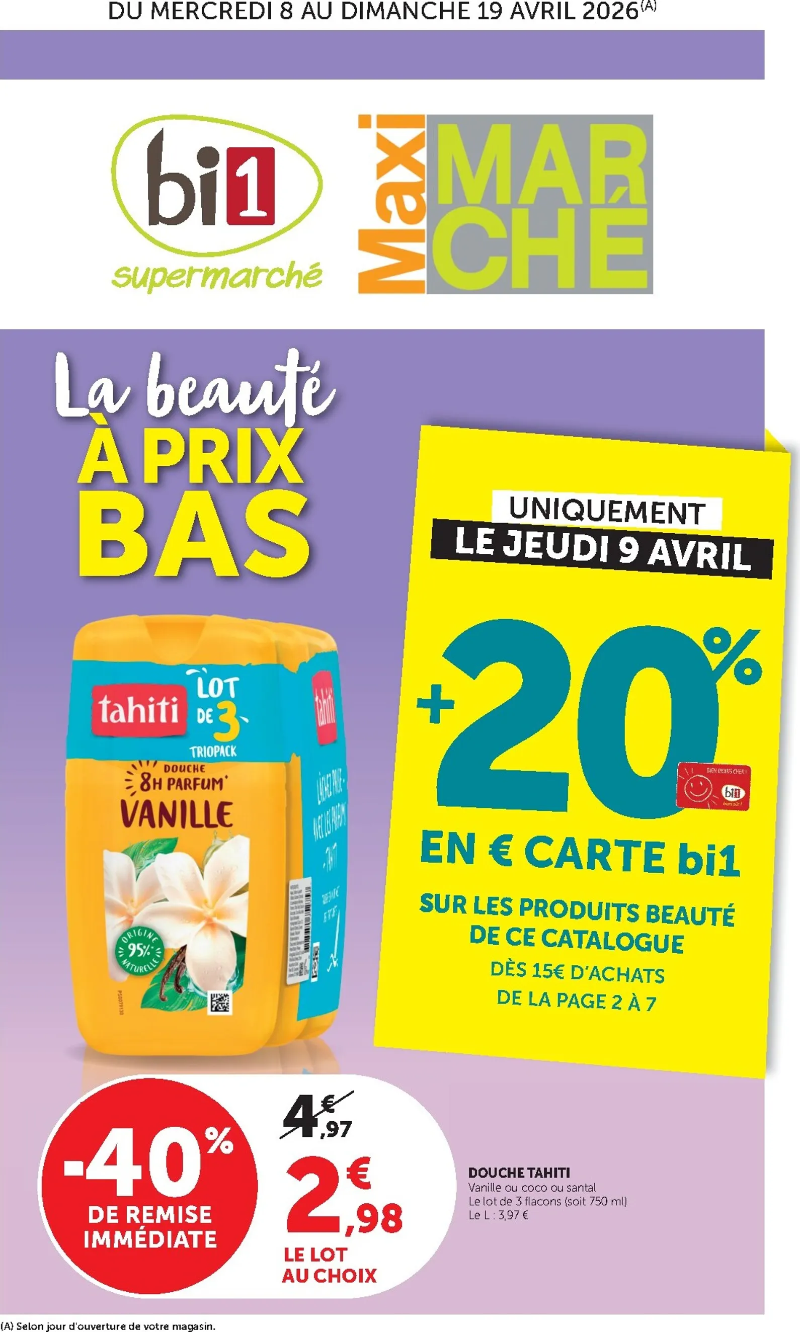 Du 8 au 19 avril 2026, votre supermarché bi1 célèbre la beauté avec des offres exceptionnelles. Le jeudi 9 avril est un jour à marquer d’une pierre blanche : bénéficiez de 20% crédités sur votre carte de fidélité pour tout achat dans les produits beauté de ce catalogue. C’est l’occasion parfaite pour faire le plein, comme avec le lot de trois gels douche Tahiti à -40%, soit 2,98€. Explorez le bi1 Catalogue du 08/04/2026 pour réaliser de belles économies sur vos marques favorites.