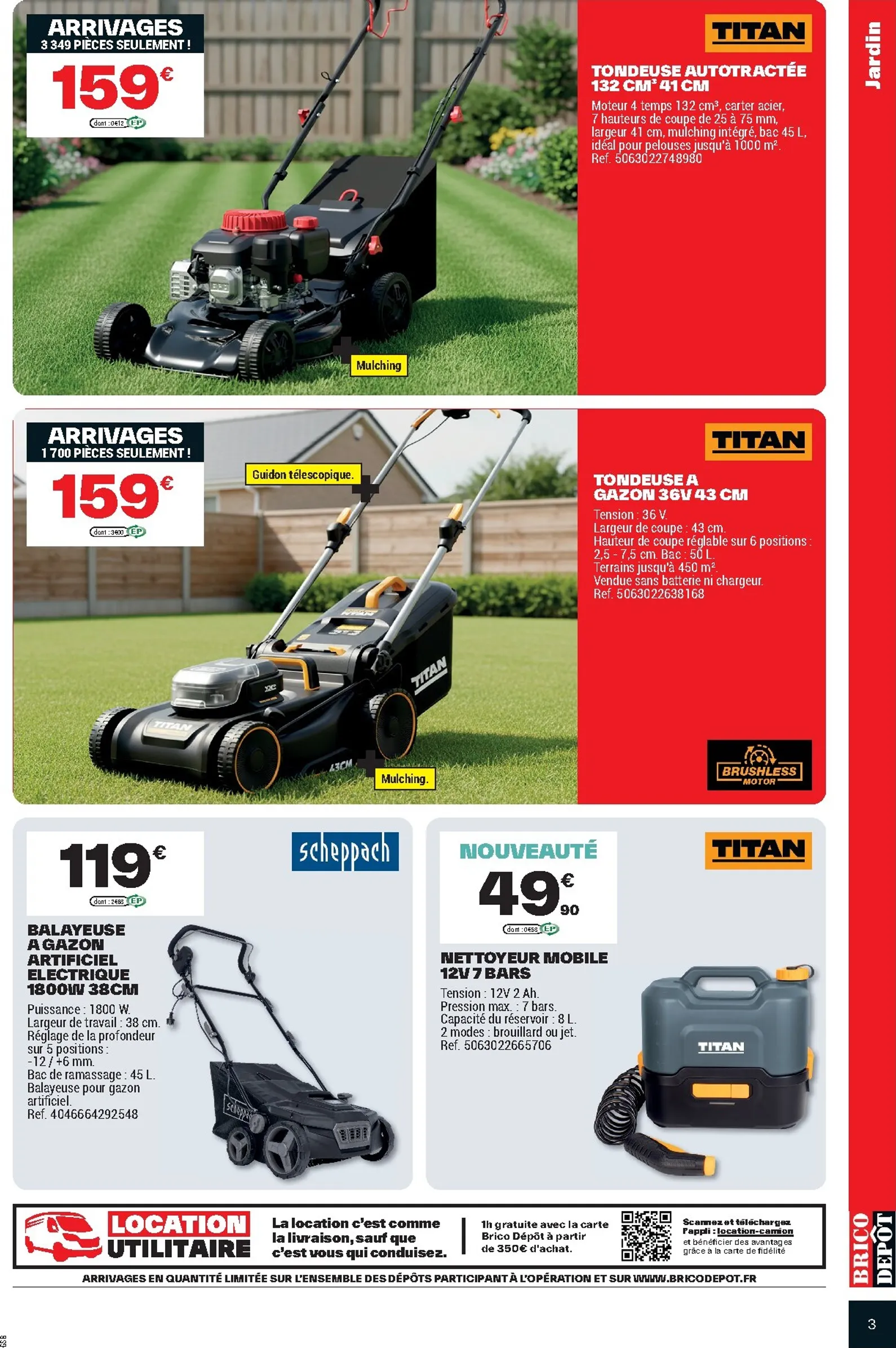 Dès le 3 avril, Brico Dépôt lance ses “Arrivages” très attendus, une occasion parfaite pour équiper votre jardin et votre atelier. Pour cette première semaine d’avril 2026, l’accent est mis sur l’extérieur avec des offres exceptionnelles. La tondeuse autotractée thermique Titan de 132 cm³, proposée à seulement 159€, est l’outil idéal pour entretenir votre pelouse sans effort. C’est le moment de consulter Brico Dépôt Catalogue du 03/04/2026 pour planifier vos achats.