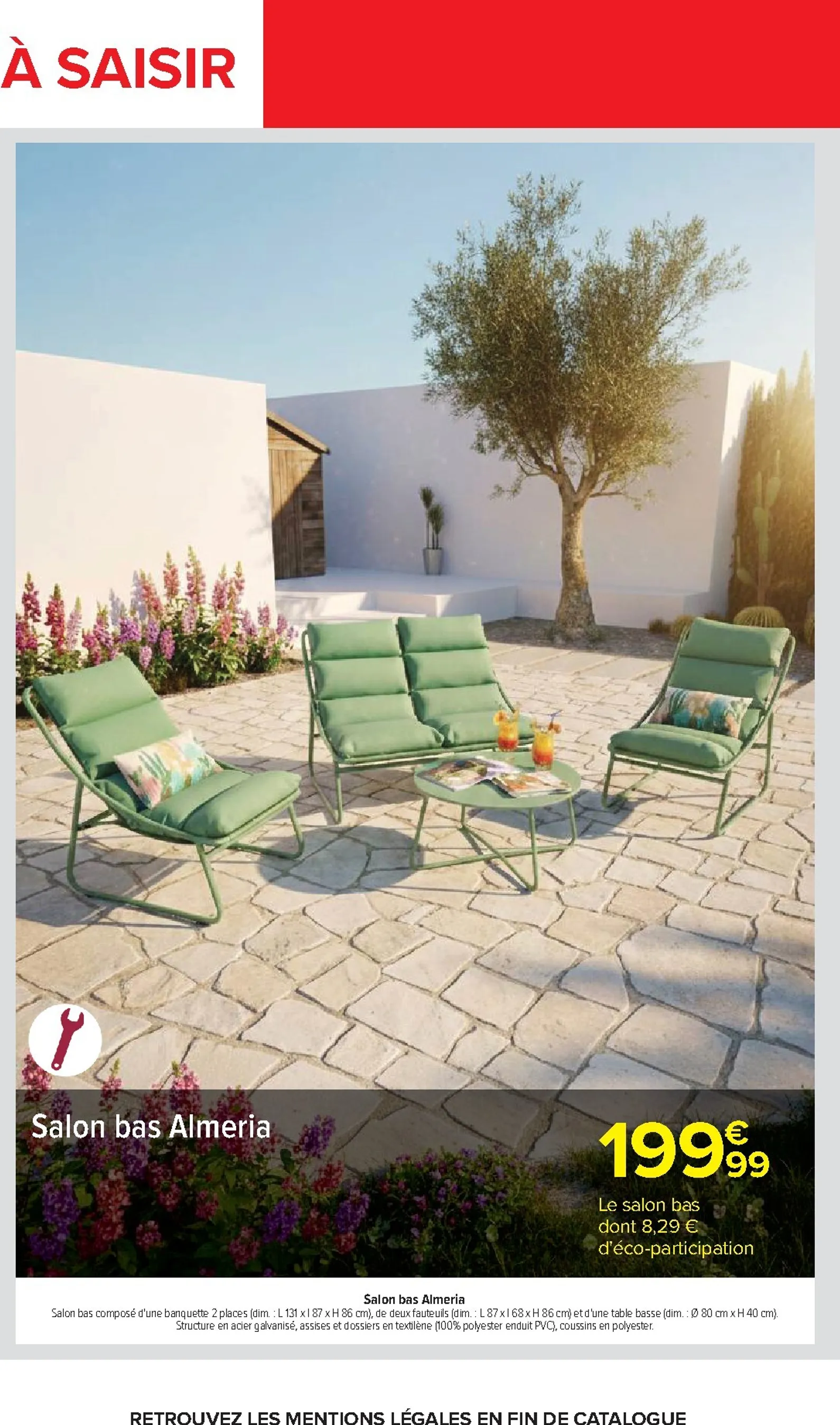 Carrefour pense aussi à l’aménagement de votre extérieur avec une offre spéciale sur le mobilier de jardin. Le salon bas Almeria, comprenant une banquette deux places, deux fauteuils et une table basse, est proposé au prix attractif de 199,99€. C’est une excellente opportunité pour créer un espace de détente convivial et moderne sur votre terrasse ou dans votre jardin avant l’arrivée de l’été.