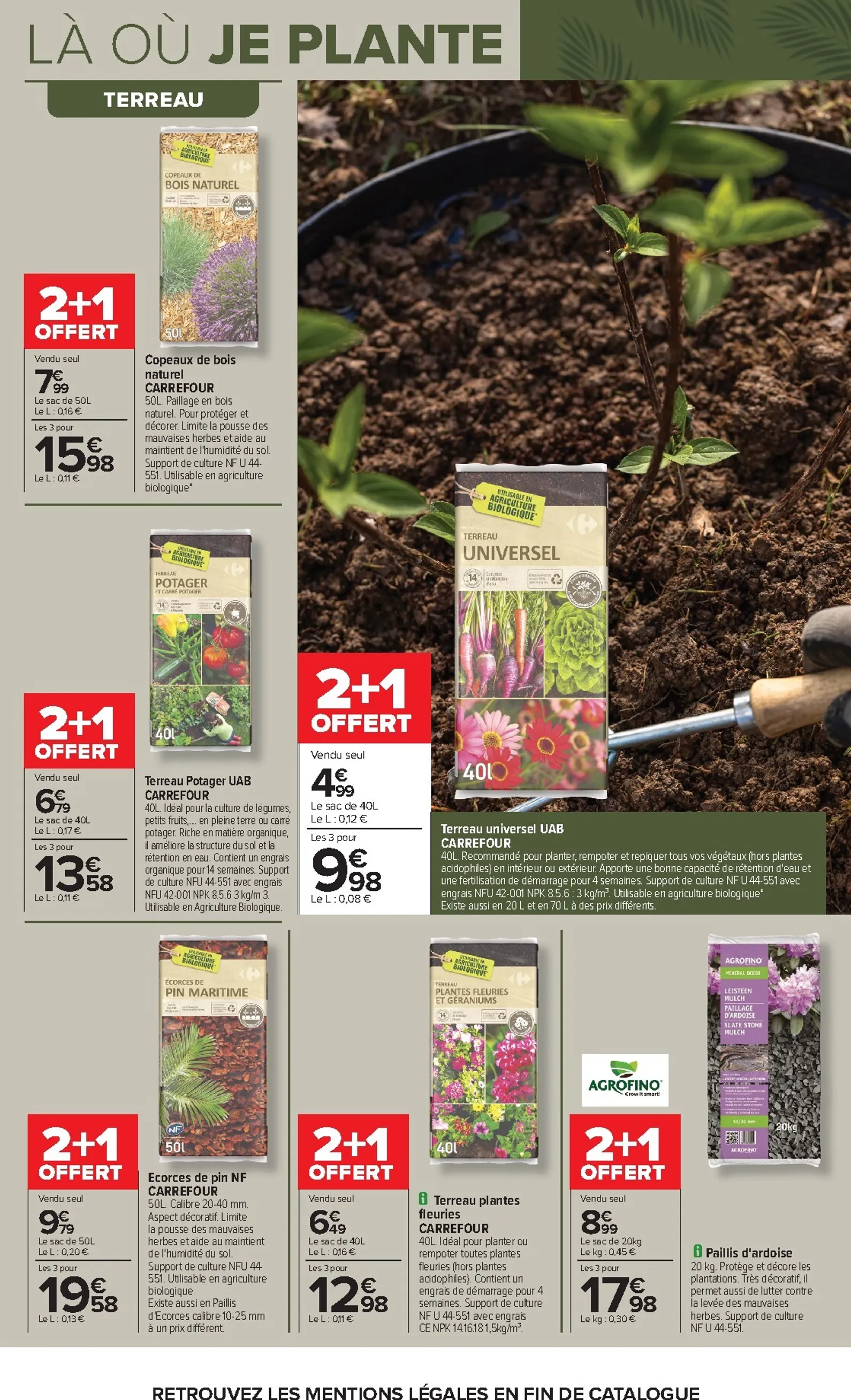 Parmi les promotions phares, ne manquez pas l’offre “-50% sur le deuxième article” sur une sélection de plantes à massif, idéales pour créer des parterres colorés. Pour nourrir vos plantations, Carrefour propose une opération “2+1 offert” sur le terreau universel UAB de 40L. Cette promotion est une aubaine pour tous les jardiniers souhaitant utiliser un produit de qualité, compatible avec l’agriculture biologique, sans se ruiner. C’est le moment de préparer la saison.