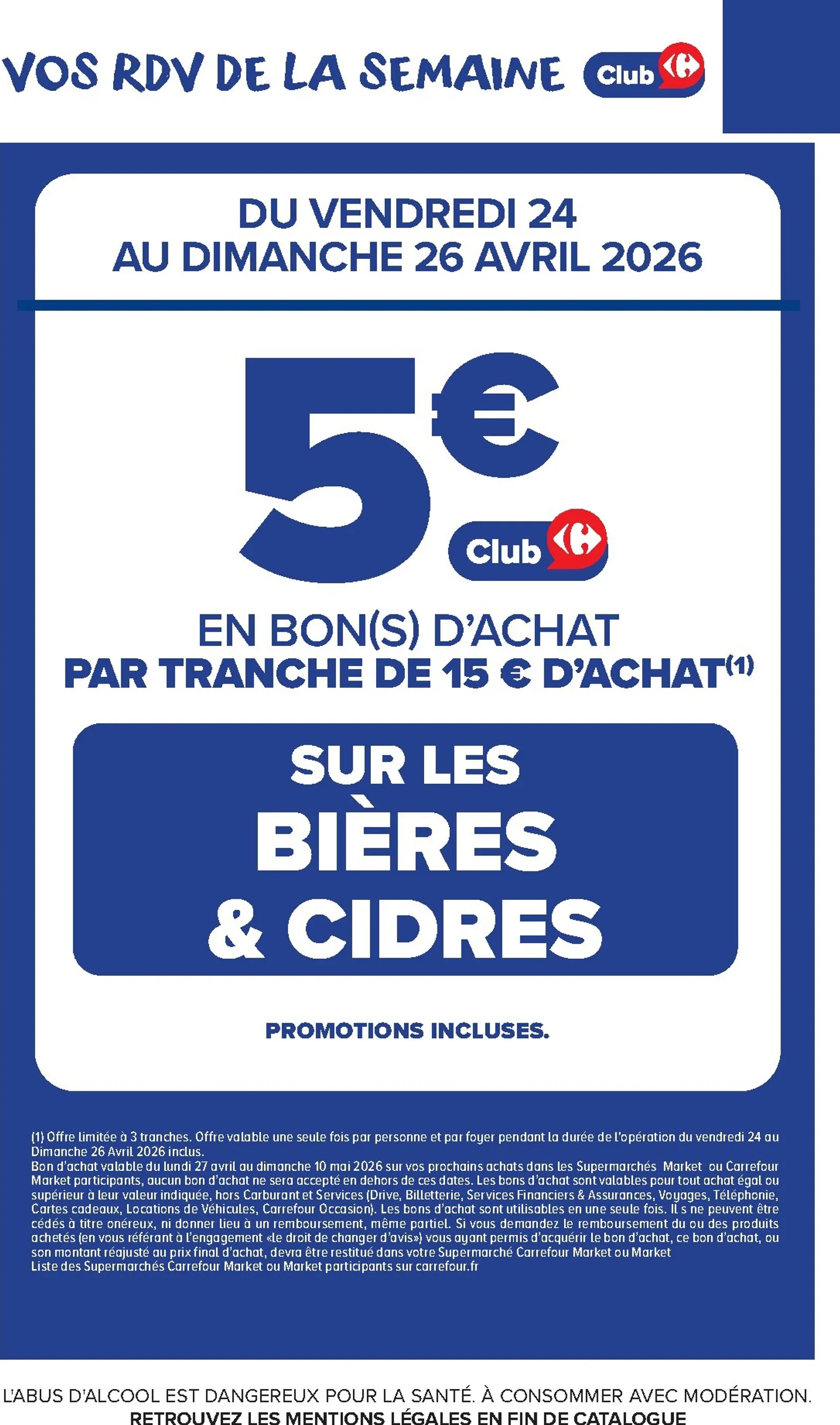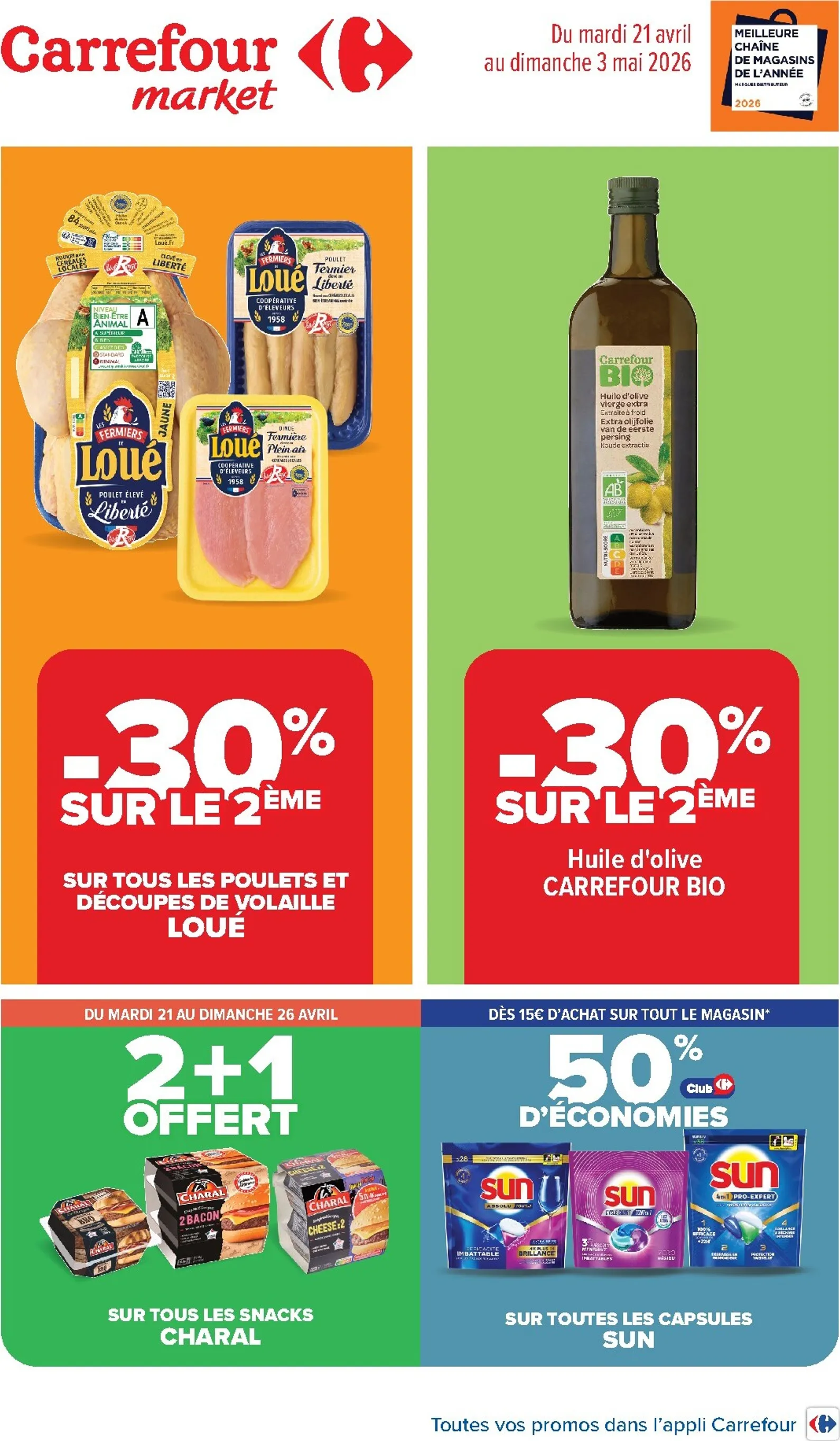Du 21 avril au 3 mai 2026, Carrefour Market vous propose une semaine de promotions. La qualité est à l’honneur avec des offres alléchantes, comme -30% sur le deuxième article de la gamme de volailles Loué. La même réduction s’applique à l’huile d’olive Carrefour BIO, parfaite pour vos assaisonnements. Le Carrefour Market Catalogue du 21/04/2026 de la semaine est l’outil parfait pour planifier vos courses et maximiser vos économies sur des produits essentiels du quotidien.