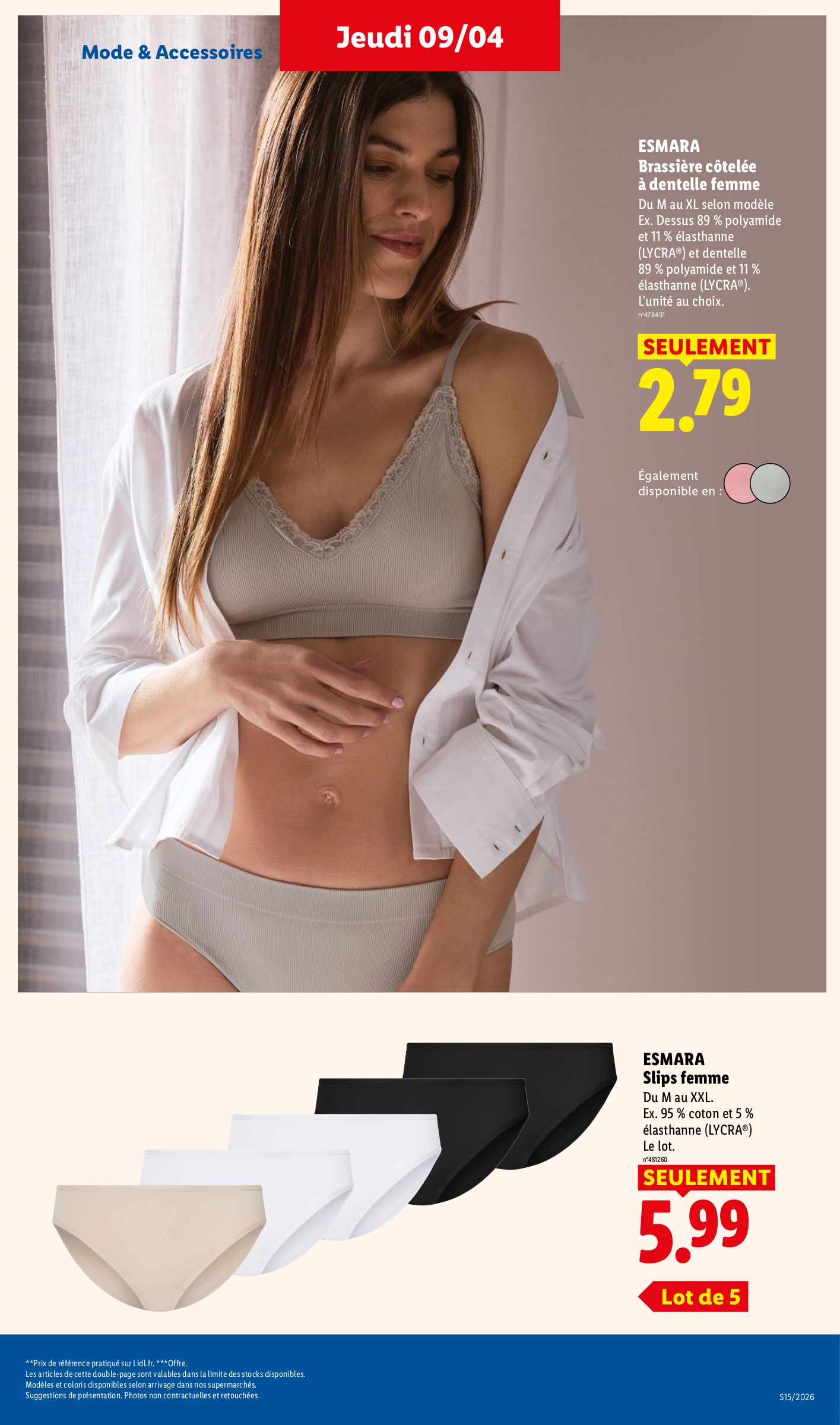 Enfin, la section mode propose confort et style à petit prix avec Esmara. La brassière côtelée à dentelle est à 2,79€, et le lot de cinq slips pour femme est à 5,99€, parfait pour renouveler ses basiques. Ces offres sont une excellente raison de se faire plaisir. Pour une vue complète des promotions, le Lidl Catalogue du 09/04/2026 est votre meilleur guide. Retrouvez tous les détails dans le Lidl Catalogue et préparez vos achats.