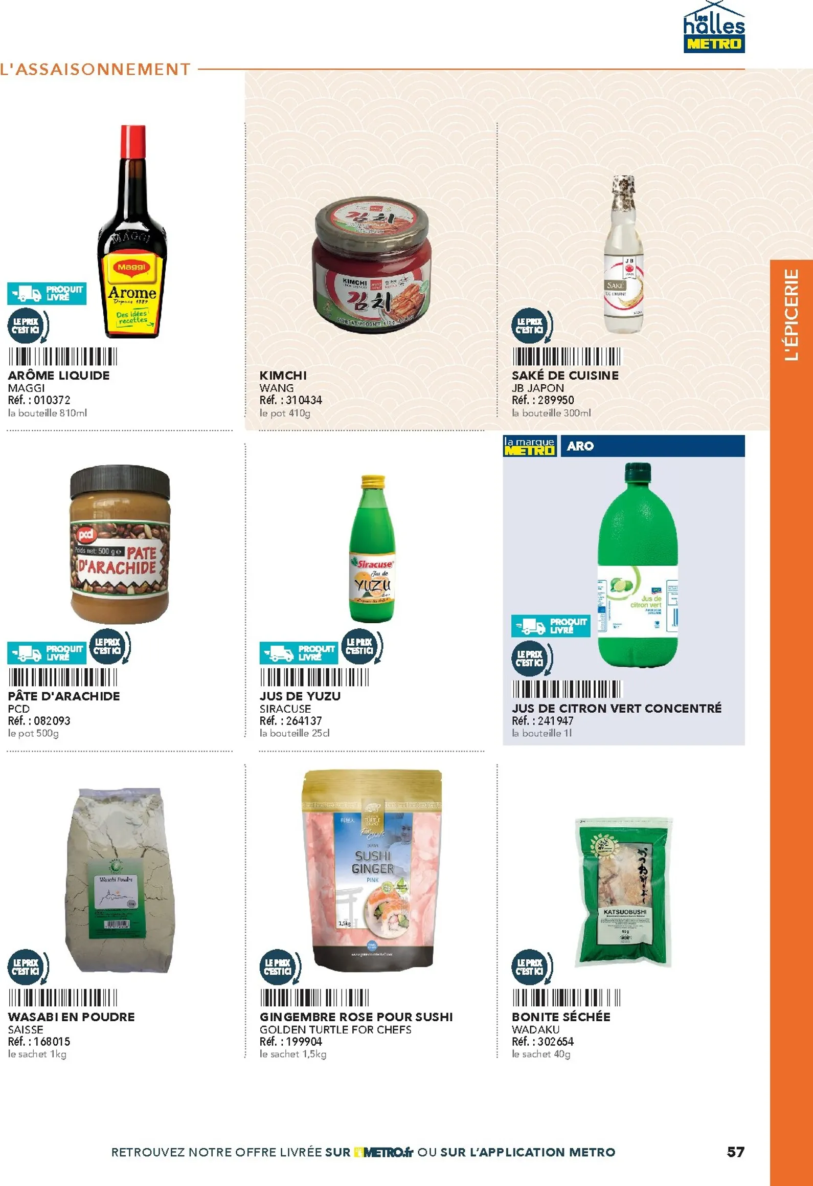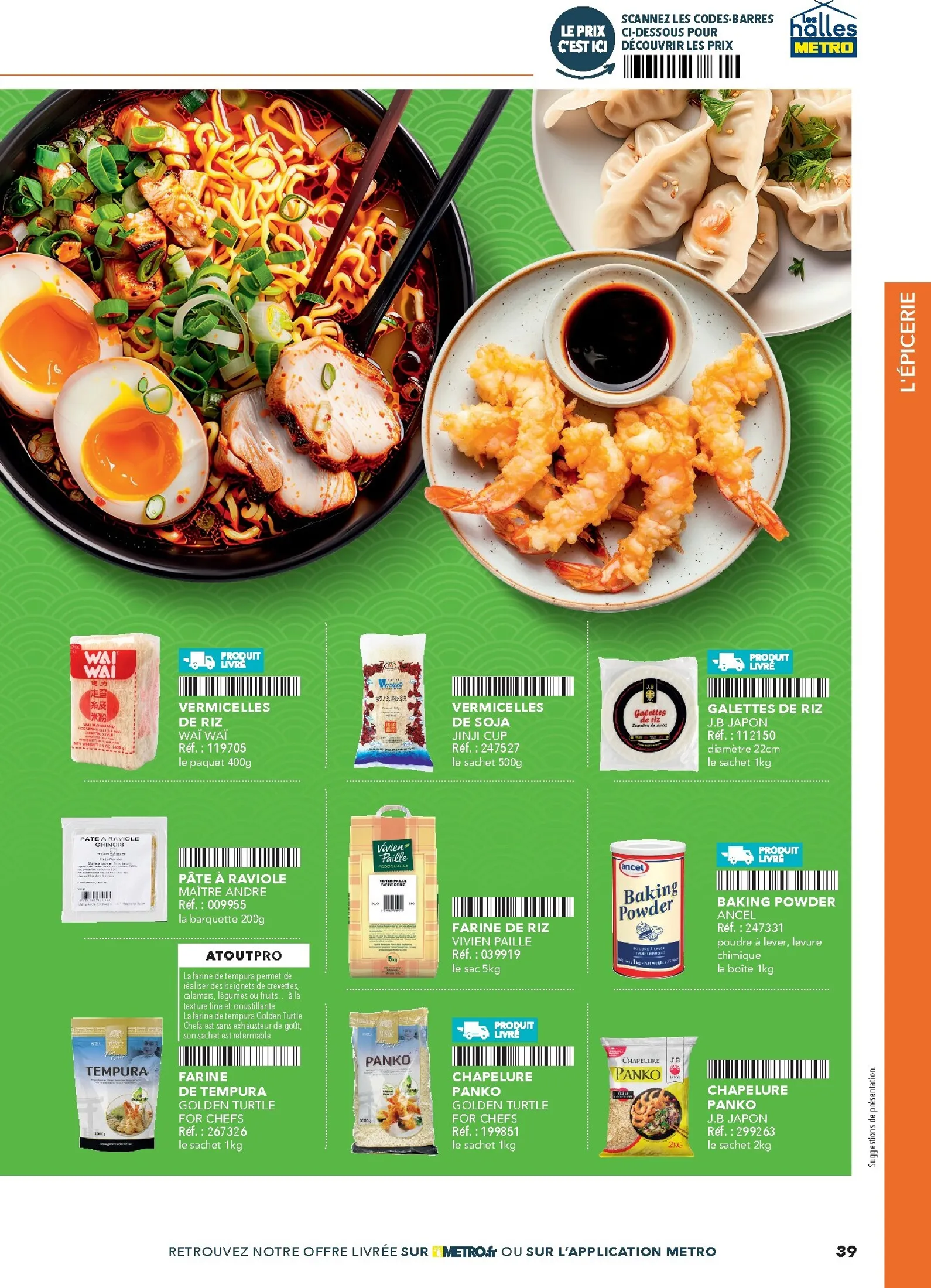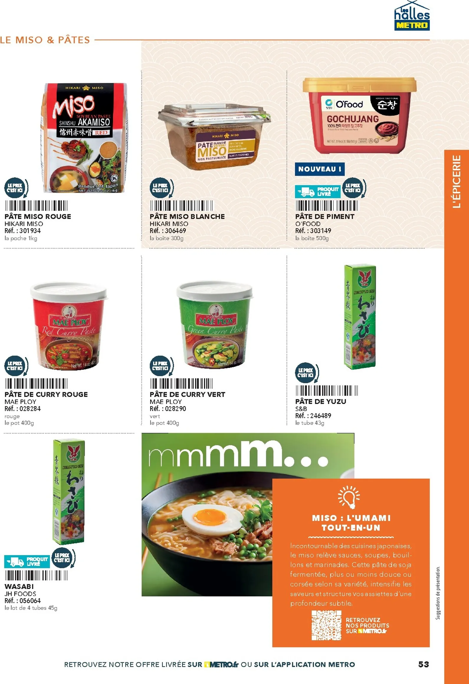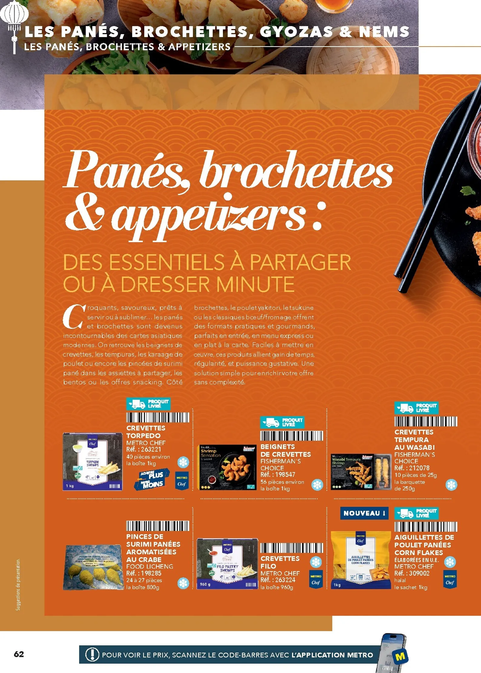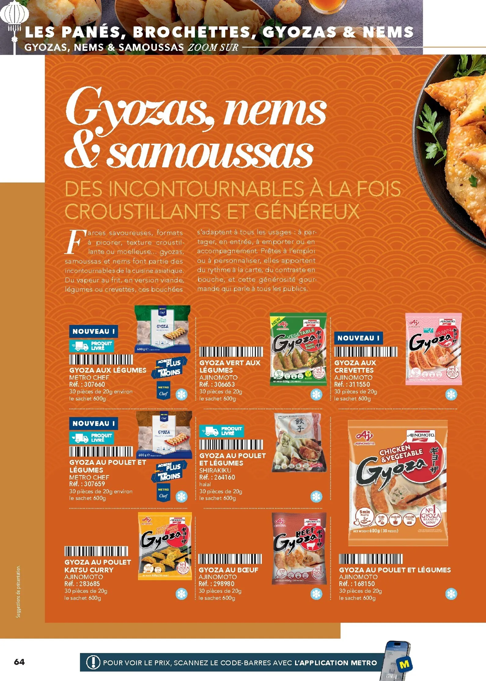 La sélection Metro couvre les besoins de votre cuisine. Découvrez des produits de la mer frais, des viandes de choix et une variété de fruits et légumes exotiques. L’épicerie regorge de riz, nouilles, sauces et épices indispensables. Des solutions pratiques comme les gyozas et nems sont parfaites pour la restauration rapide, tandis que les mochis surgelés apporteront une touche finale originale et tendance à vos menus.