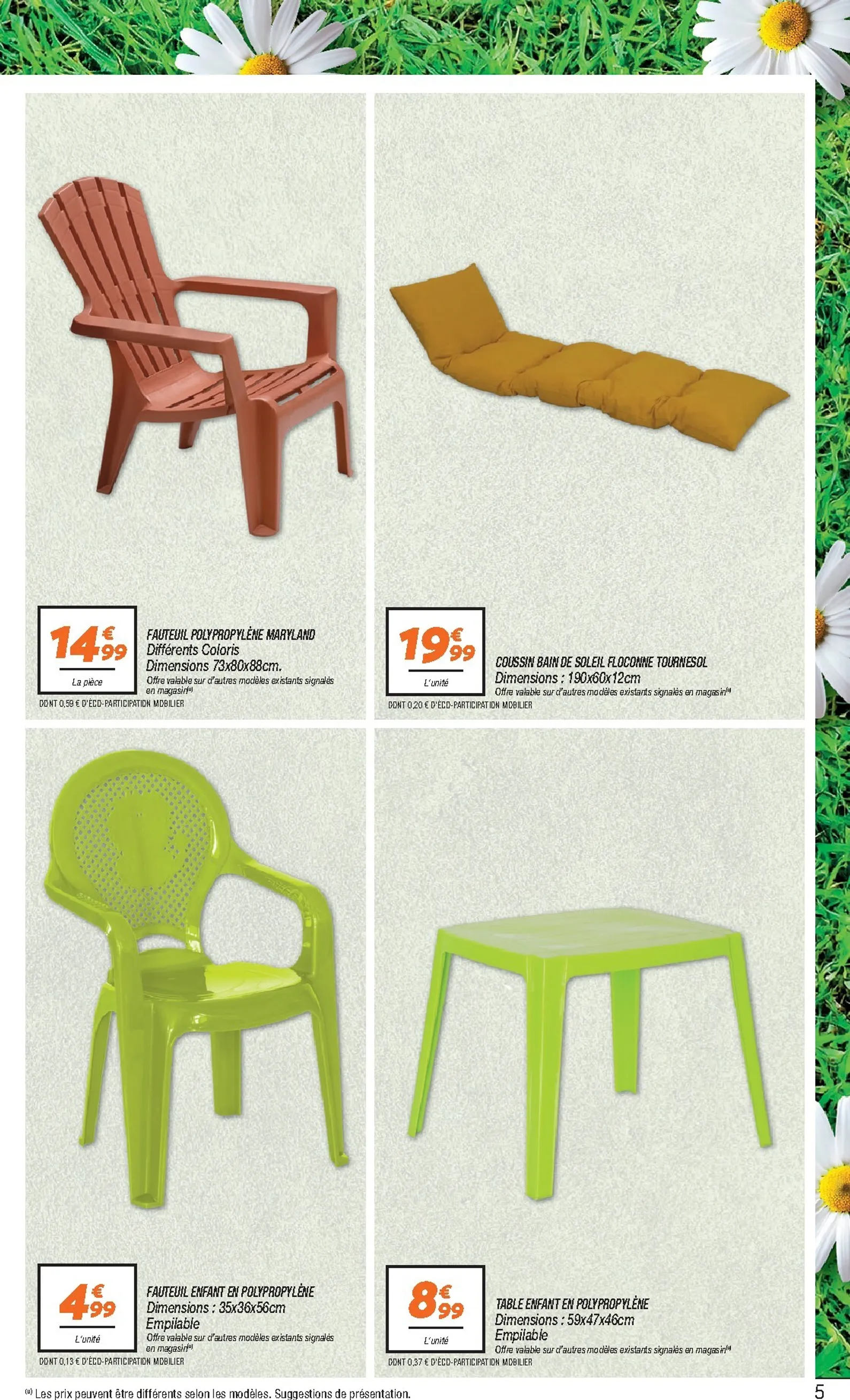 Le confort est également à l’honneur cette semaine. Le transat Bêta Fushia est à 19,99€, une invitation à la paresse au soleil. Créez un coin repas charmant avec le set bistro en acier, comprenant une table et deux chaises, pour 49,99€. Pour plus de confort, ajoutez l’assise de chaise floconnée à 2,99€. Les fauteuils empilables blancs à 8,99€ sont parfaits pour accueillir vos invités.