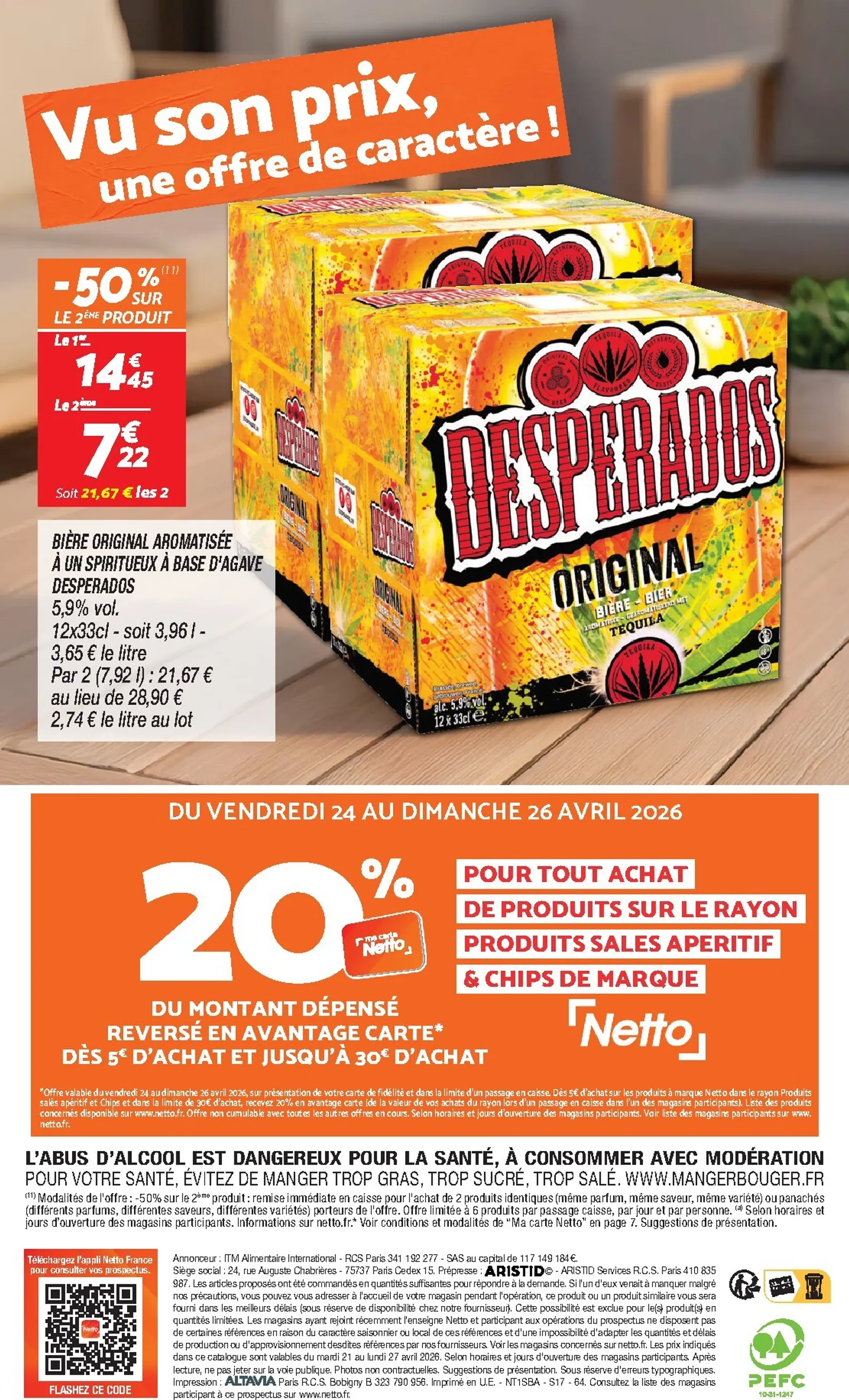 Pour couronner le tout, du 24 au 26 avril, bénéficiez de 20% reversés sur votre carte de fidélité pour l’achat de produits apéritifs. Cette offre est parfaite pour organiser vos soirées. Pour ne manquer aucune bonne affaire, consultez en détail le Netto Catalogue du 21/04/2026 de la semaine. Vous pouvez retrouver l’intégralité des offres dans le Netto Catalogue disponible en ligne pour votre consultation.