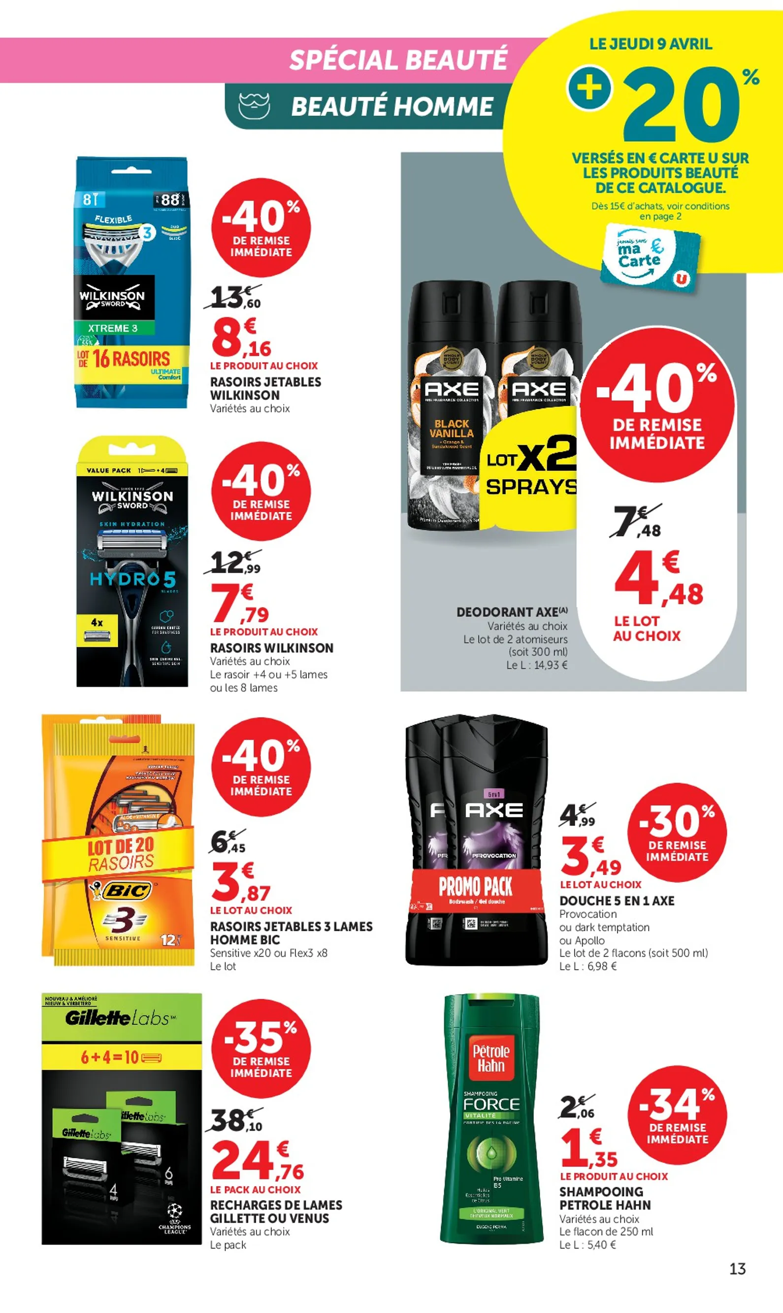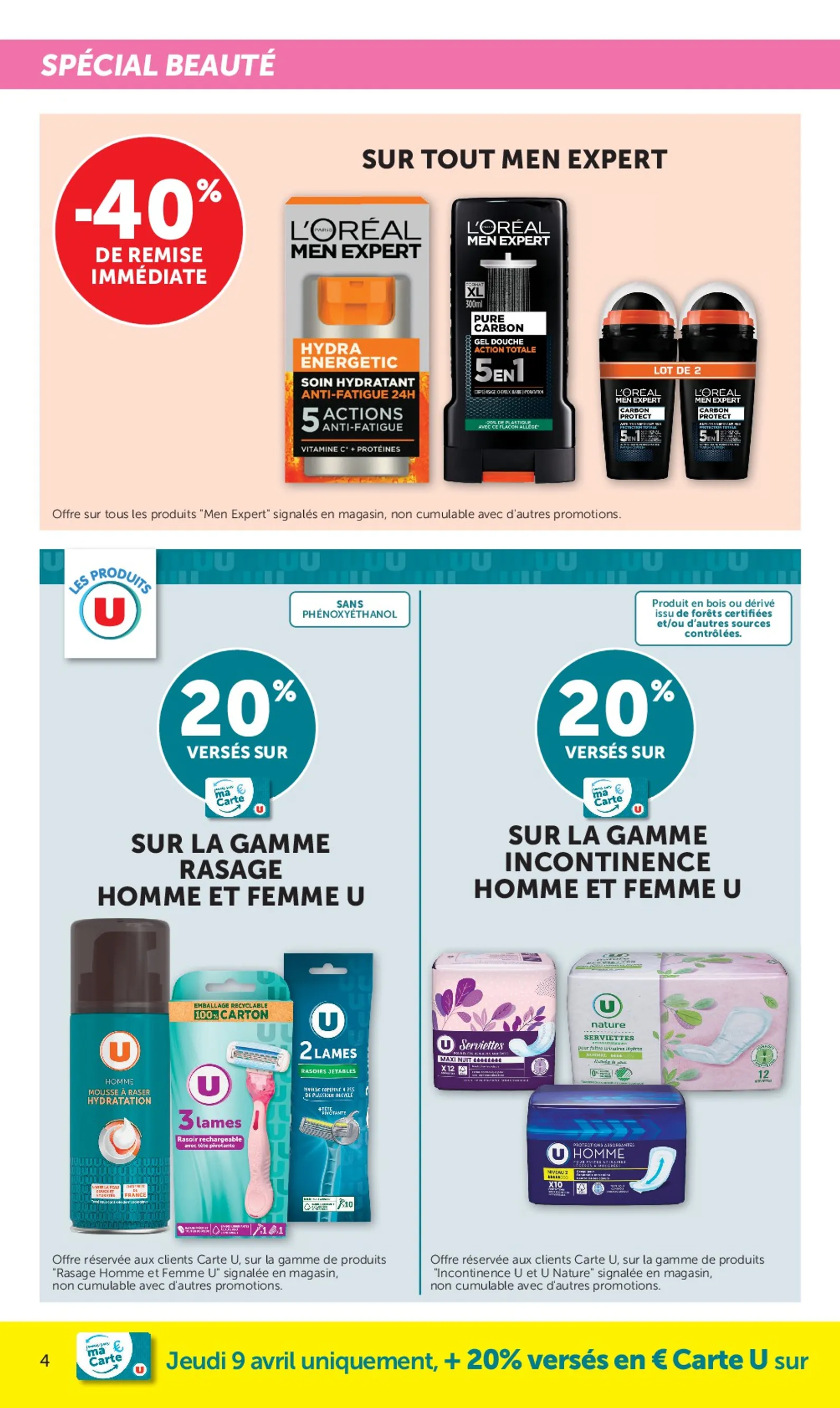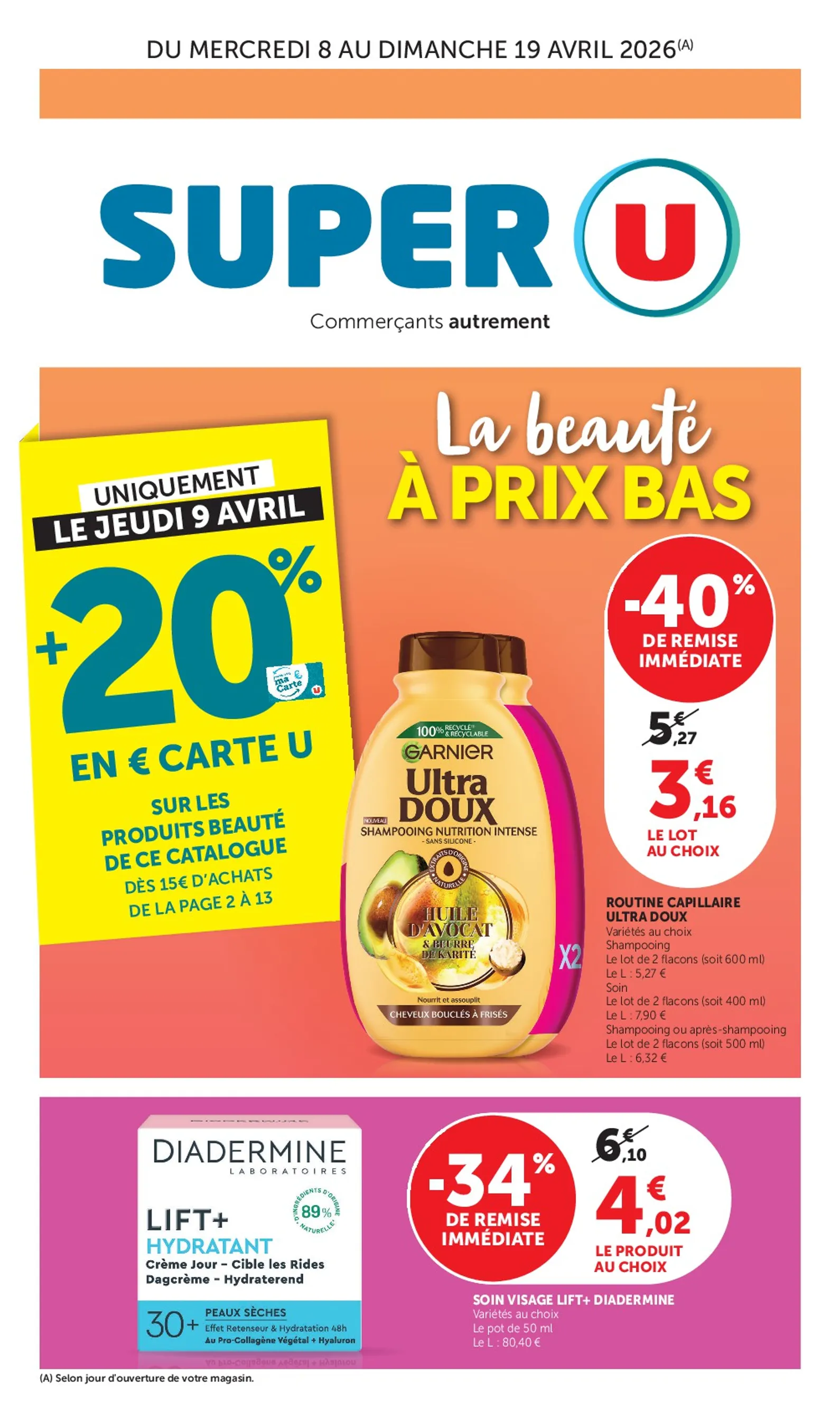 Du 8 au 19 avril 2026, Super U met la beauté à l’honneur avec des promotions. Cette semaine, profitez de remises sur vos marques favorites et ne manquez pas la journée du jeudi 9 avril : 20% de vos achats beauté (dès 15€) seront crédités sur votre Carte U. C’est le moment idéal pour renouveler votre routine. Ce Super U Catalogue du 08/04/2026 regorge d’offres exclusives pour prendre soin de vous.
