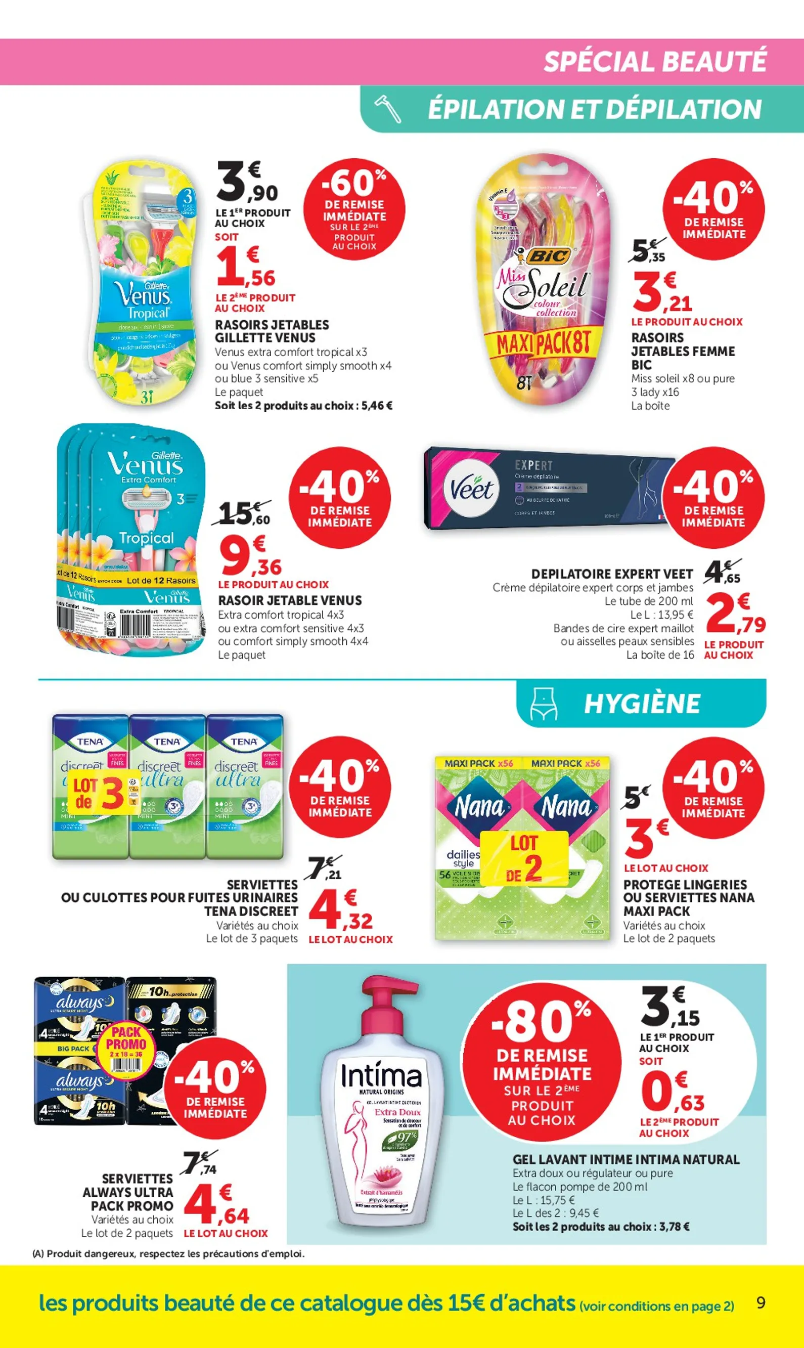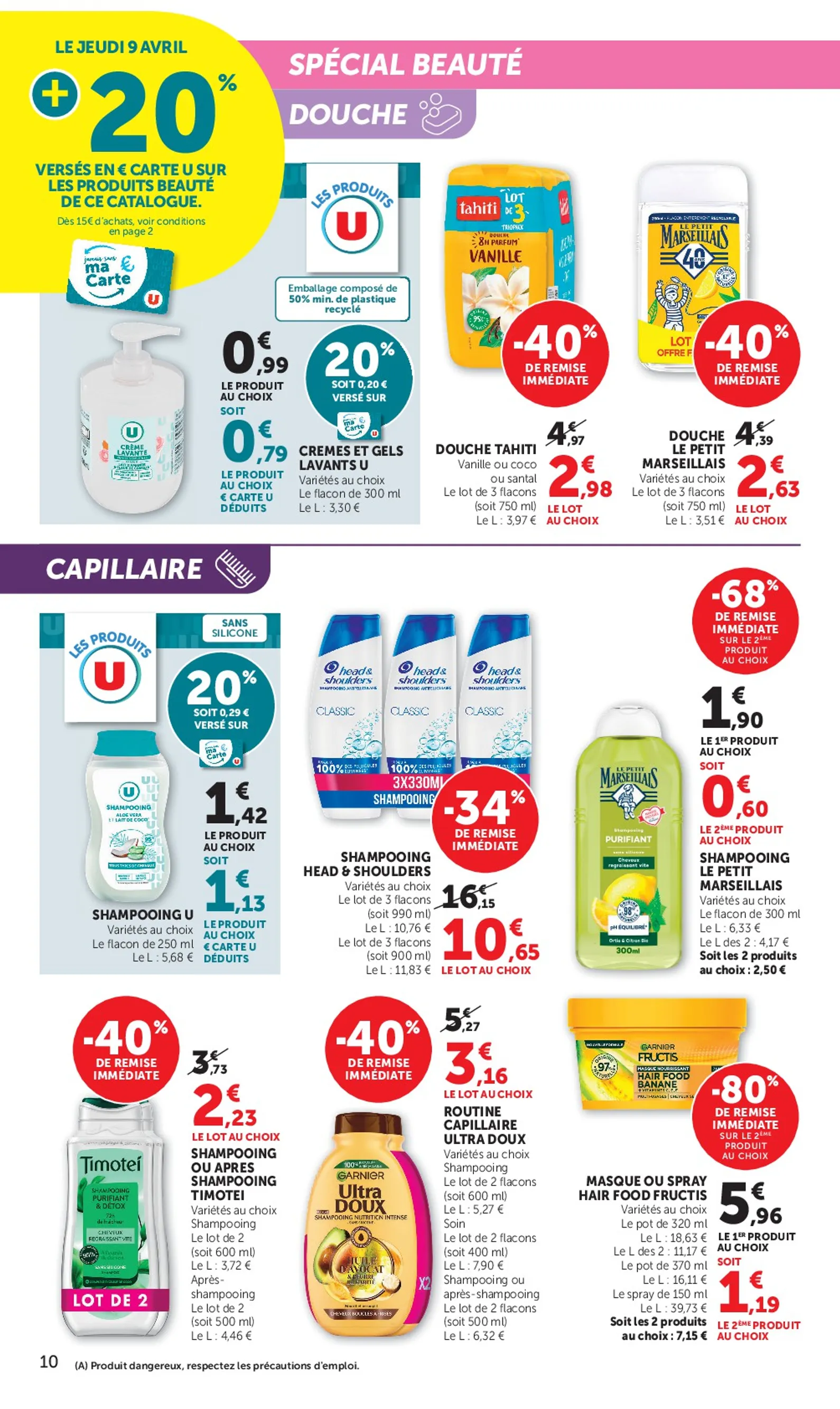 Le prospectus est rempli de réductions immédiates. La gamme capillaire Ultra Doux de Garnier bénéficie de 40% de remise, le lot de deux passant à 3,16€. Pour le visage, la crème Diadermine Lift+ Hydratant est à seulement 4,02€ grâce à 34% de réduction. Côté corps, Dove propose une offre choc : le deuxième produit identique est à -80%, valable sur les gels douche et déodorants.