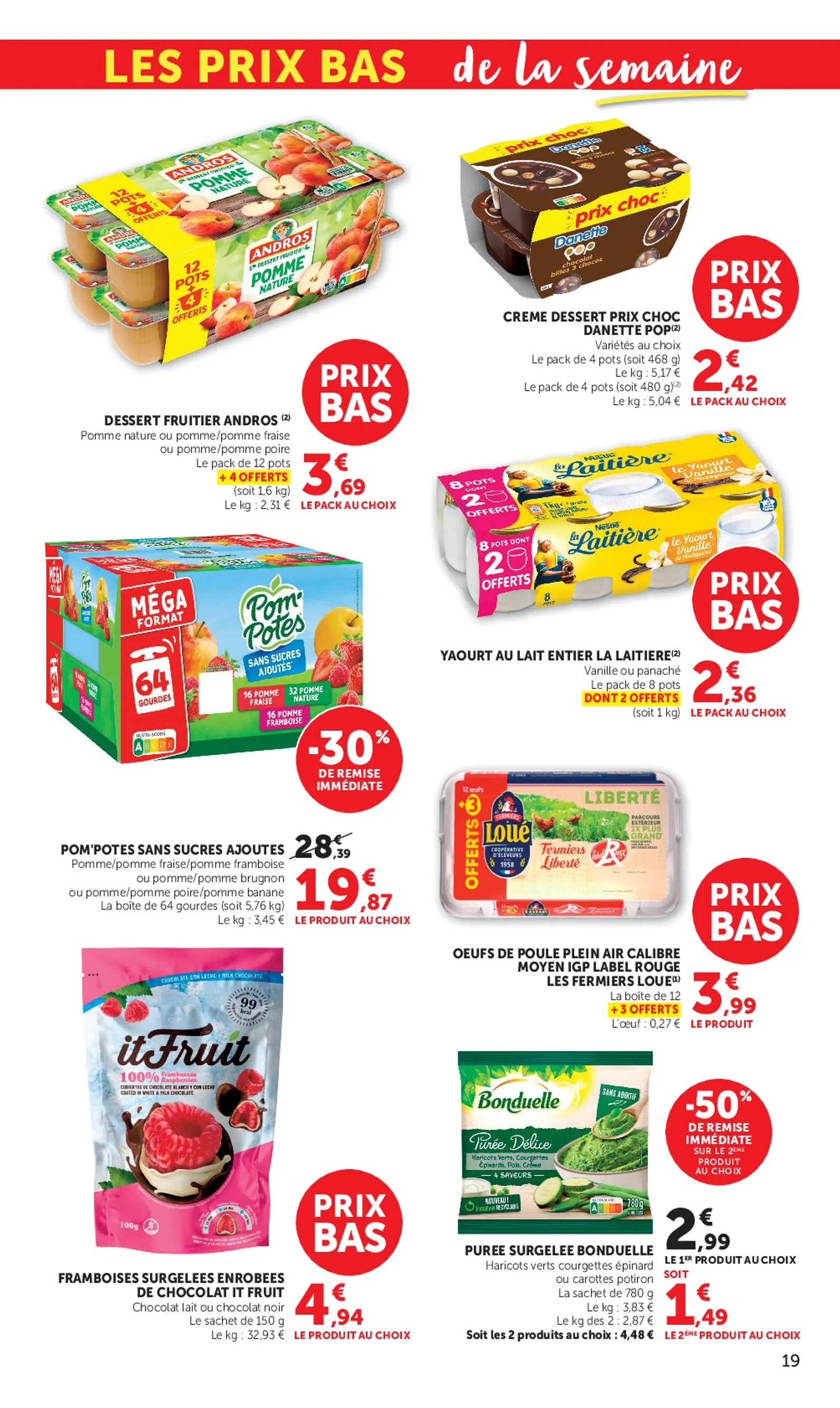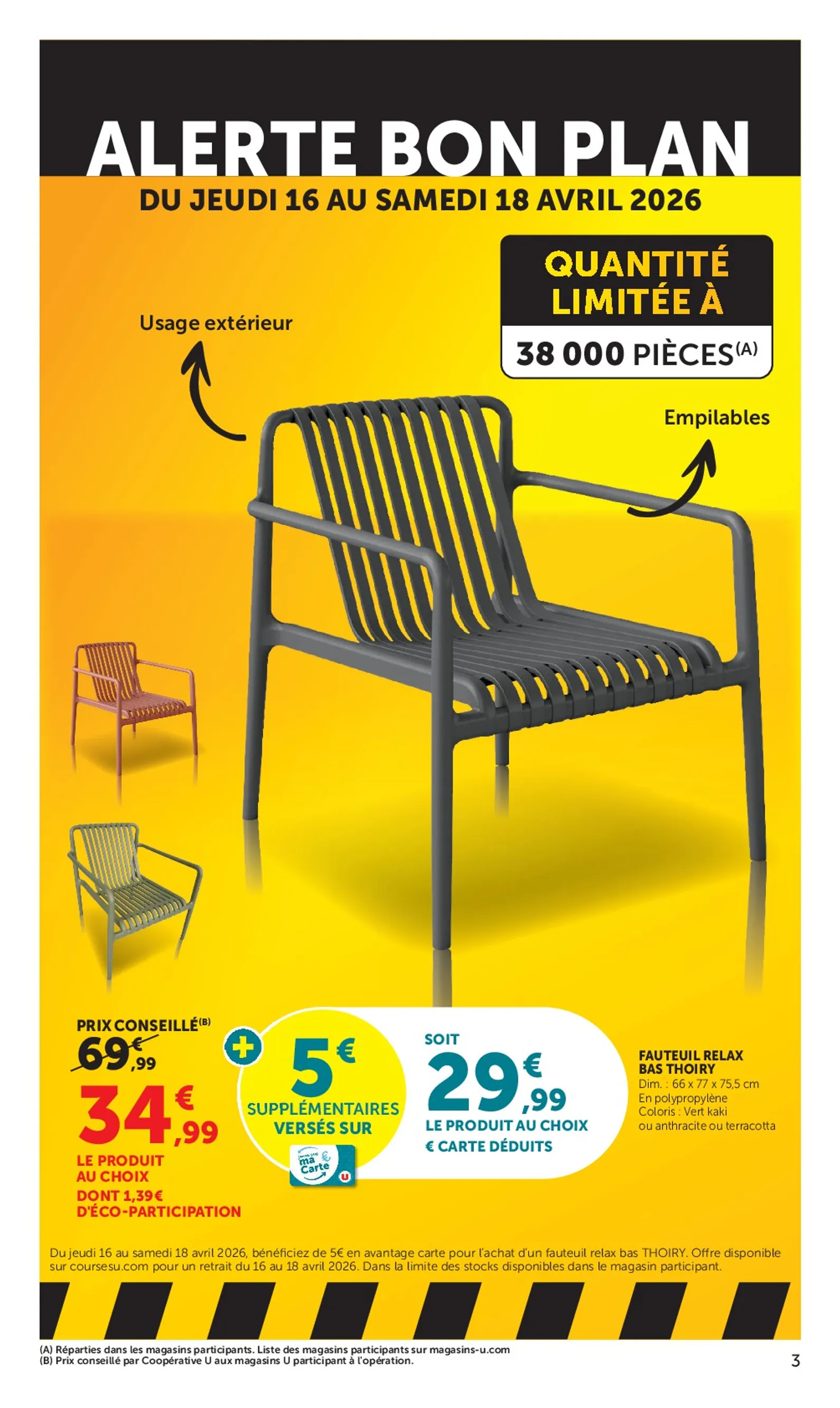 Le catalogue surprend avec une “Alerte Bon Plan” pour le jardin du 16 au 18 avril. Le fauteuil relax bas THOIRY, parfait pour l’extérieur, est à un prix incroyable. Son prix passe de 69,99 € à 29,99 € après déduction de l’avantage Carte U de 5 €. Côté gourmandise, laissez-vous tenter par les fraises Gariguette origine France à prix bas et les crèmes dessert Monoprix U avec 60% de remise sur le deuxième pack.