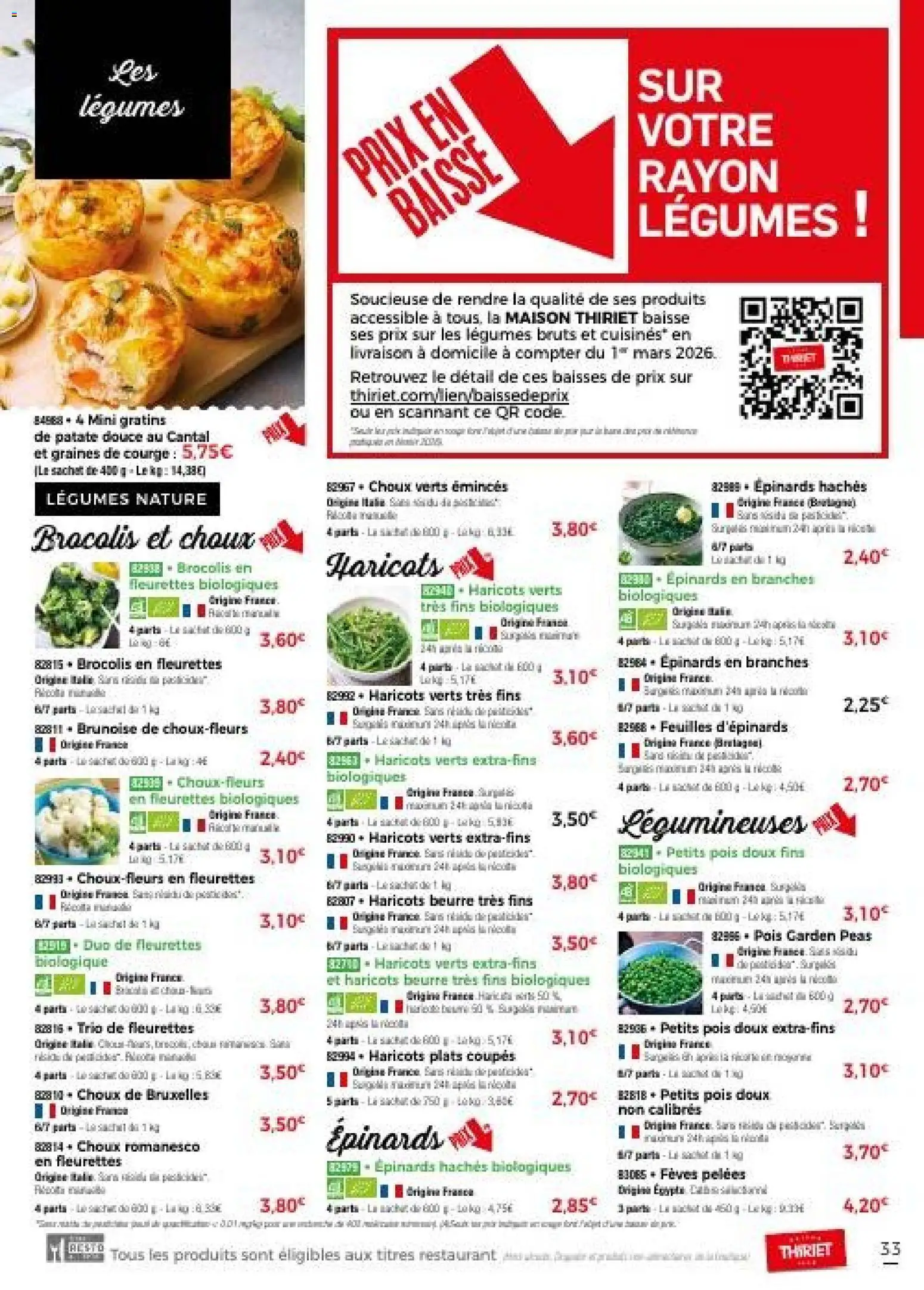 Ces promotions ne sont que quelques exemples parmi une large sélection. Vous retrouverez également des prix réduits sur les brocolis, les petits pois, les épinards ou encore les carottes. Cette promo Thiriet du 1 mars au 23 juin 2026 est une véritable invitation à redécouvrir le plaisir de cuisiner des produits simples, sains et pratiques. N’attendez plus pour remplir votre congélateur et préparer de délicieux repas pour toute la famille, en toute simplicité et sans vous ruiner.